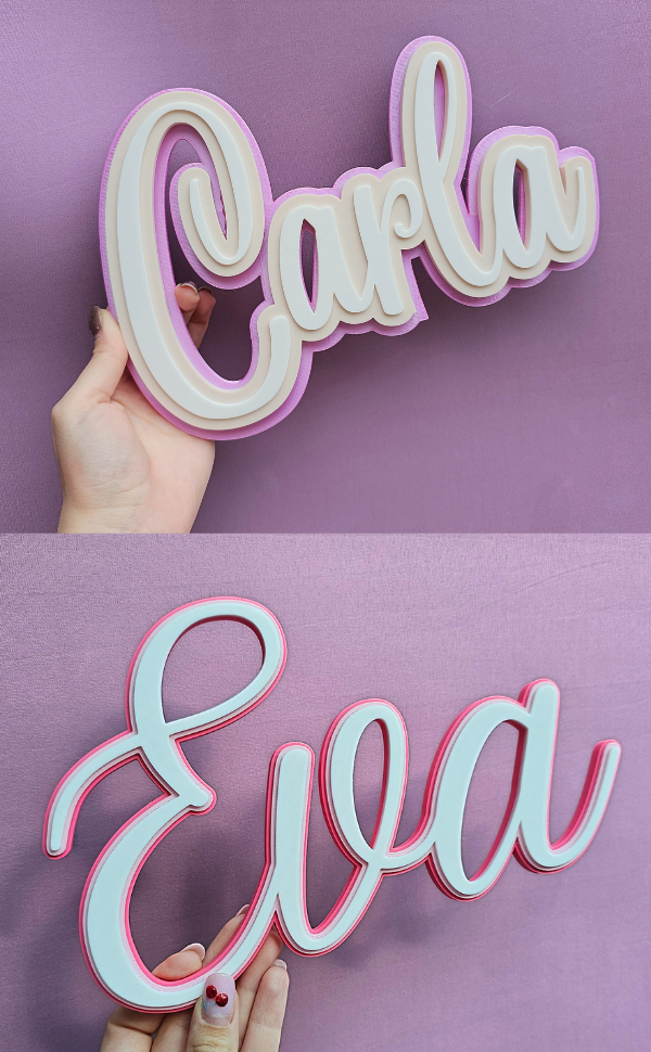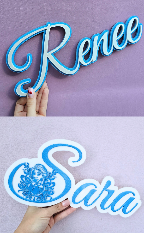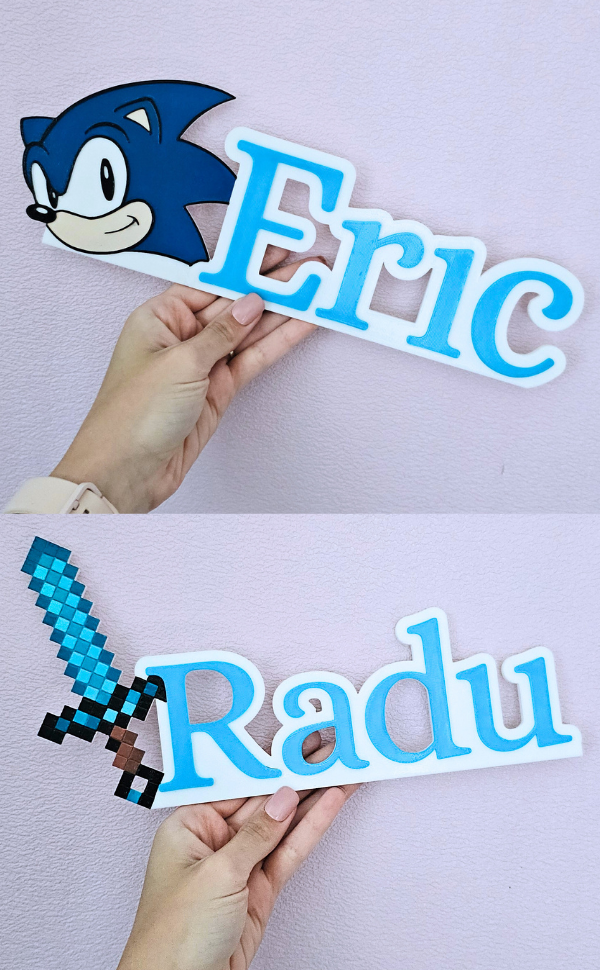În imaginile de mai sus sunt prezentate câteva exemple de semne personalizate cu nume, realizate prin imprimare 3D si pictura pe anumite elemente. Acestea pot fi adaptate în orice culoare și cu diverse elemente decorative.