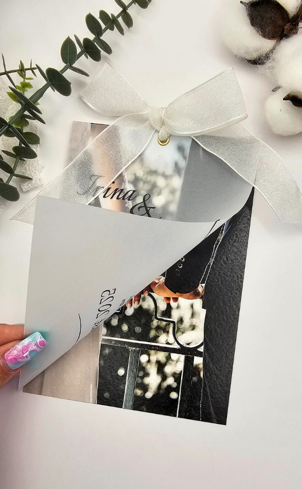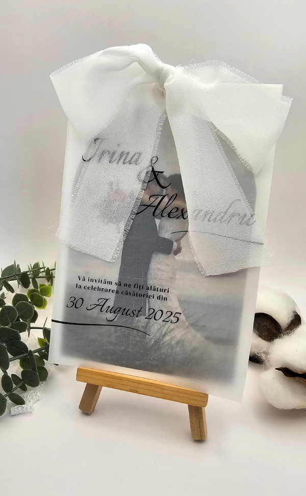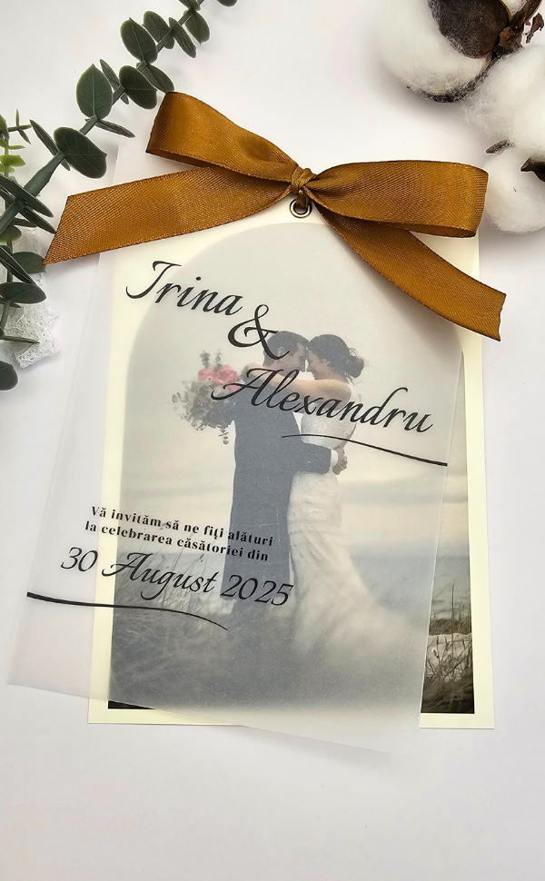 - Invitația este formată din hârtia cu poza si scrisul pe verso, foaia de calc, capsa si funda.