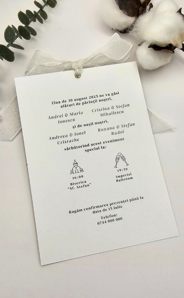 Invitație elegantă, simplă și potrivită pentru orice eveniment. Personalizată după preferințele și nevoile evenimentului vostru.