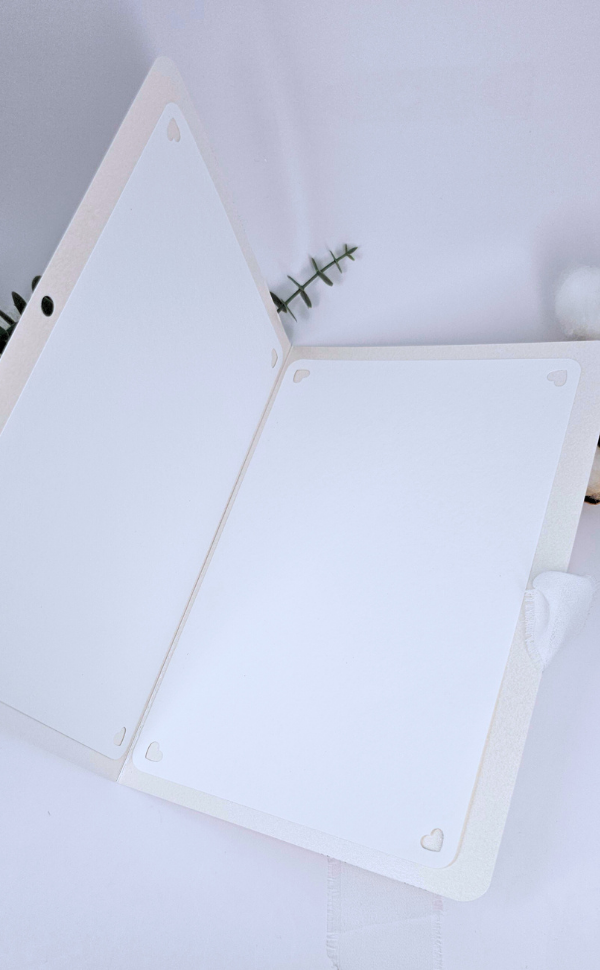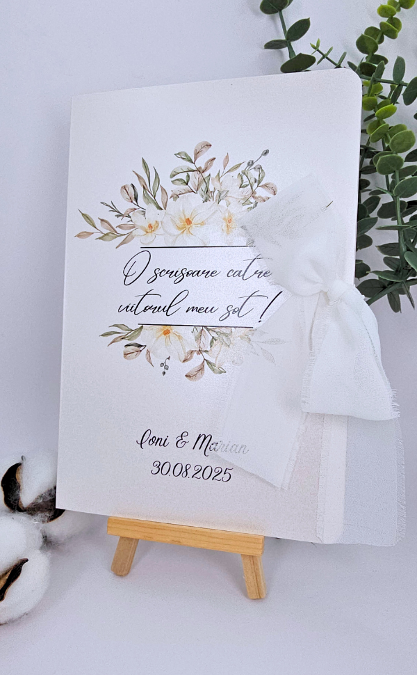 Felicitarea este realizată din carton premium de 300 g, cu finisaj sidefat, având la interior două coli de hârtie, panglică pentru închidere și un design personalizabil, ales în funcție de tematica evenimentului tău.